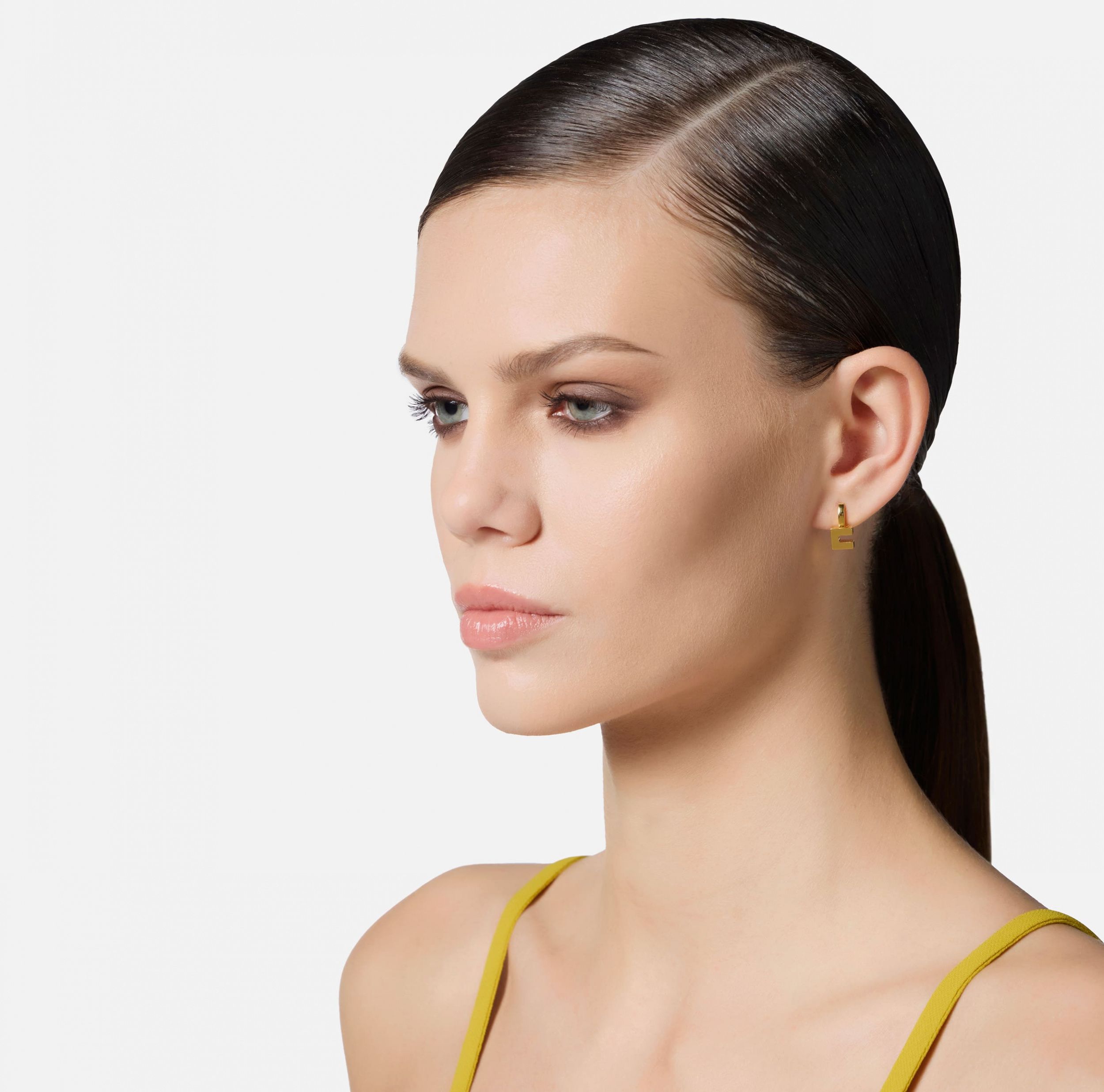 Серьги в форме арки минималистичного дизайна с маленьким логотипом.