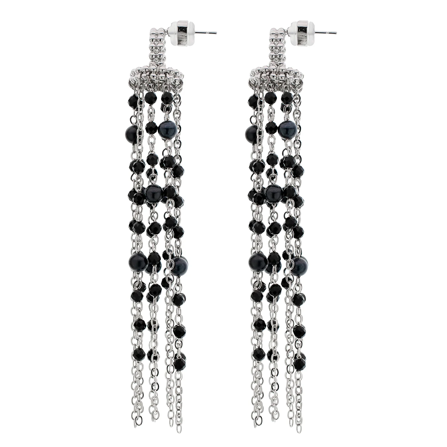 Серьги собраны вручную из цепей ажурного плетения со вставками из натурального черного жемчуга и черного циркона. Застёжка-гвоздик. Цвет серебряный.