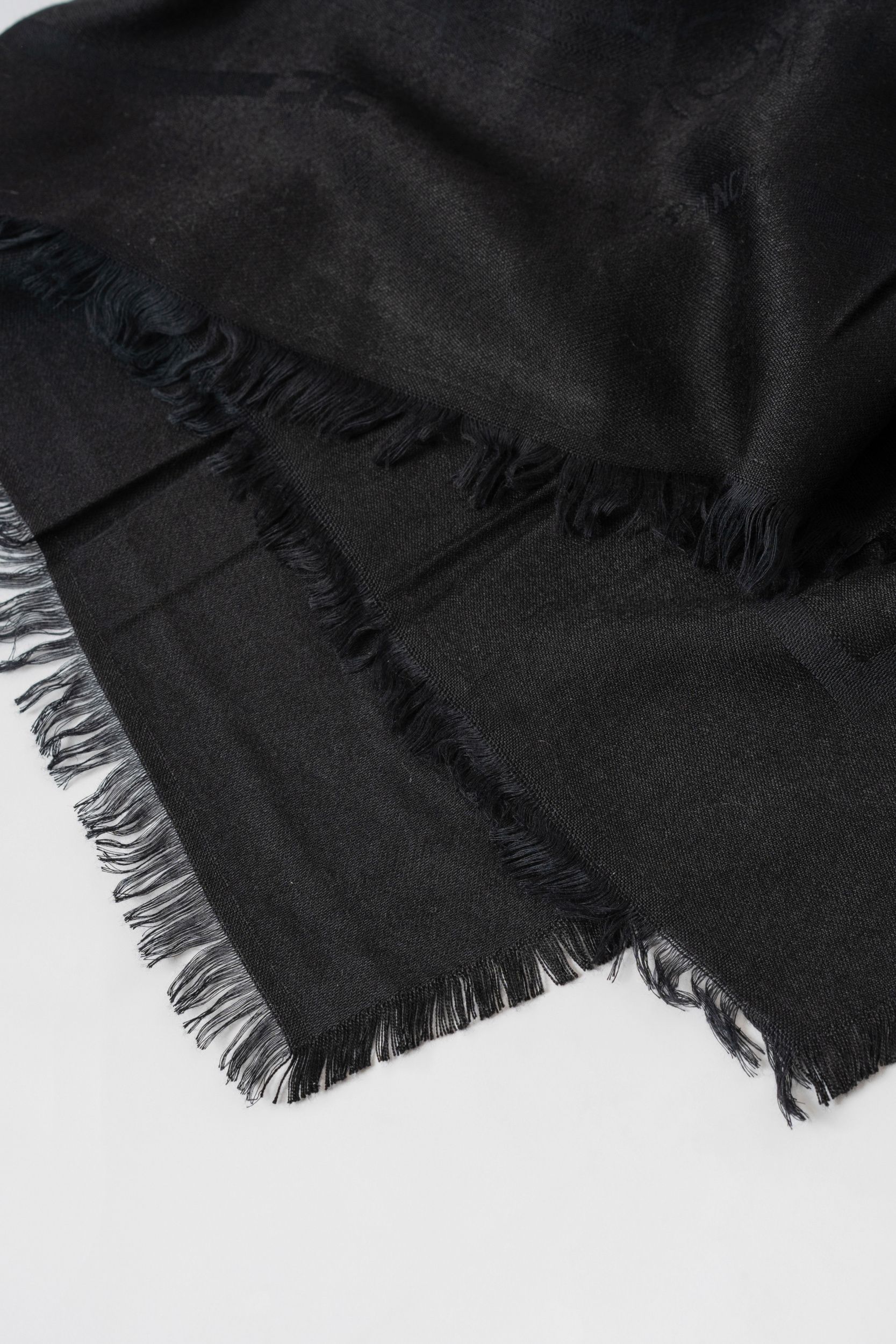 Модель классической прямоугольной формы с принтом в виде паттерна логотипа бренда и короткой бахромой по краям.