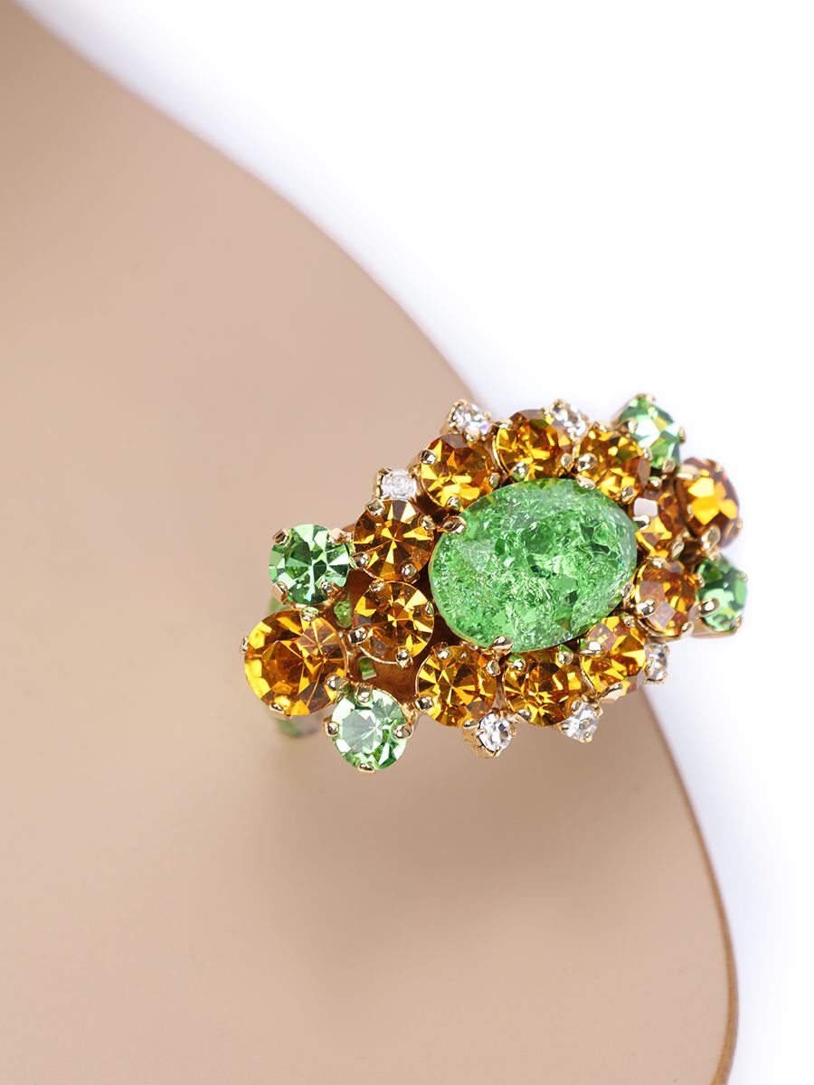 Модель на низком каблуке с закругленным открытым носком и двумя союзками с декором.