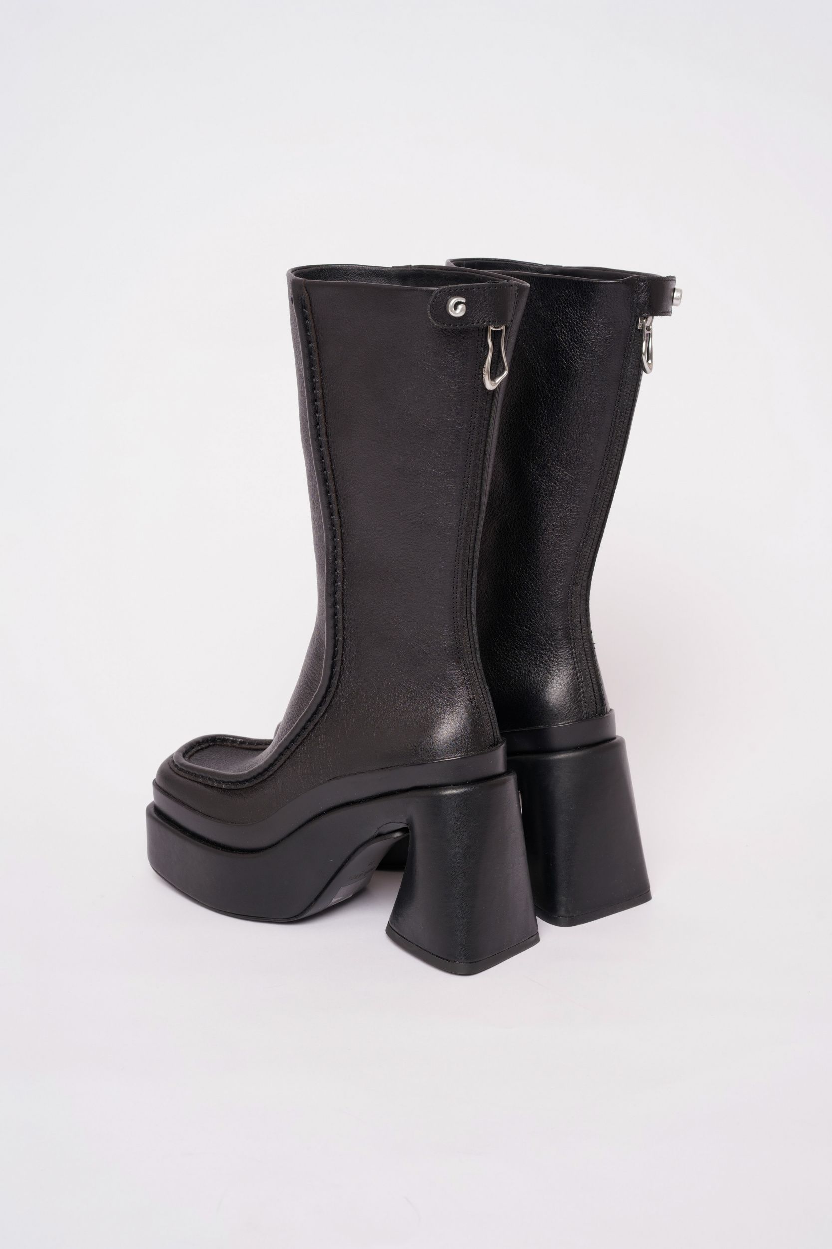 Модель с квадратным мысом, форму которого подчеркивает объемный декоративный шов, платформой, высоким устойчивым каблуком, застежкой на молнию сзади, внутренней отделкой из натуральной кожи.