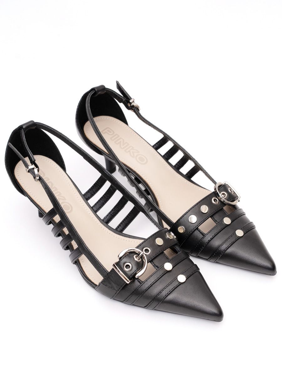 Модель с зауженным мысом, каблуком средней высоты, декоративными заклепками и ремешками с пряжками, создающими стильный и дерзкий акцент.