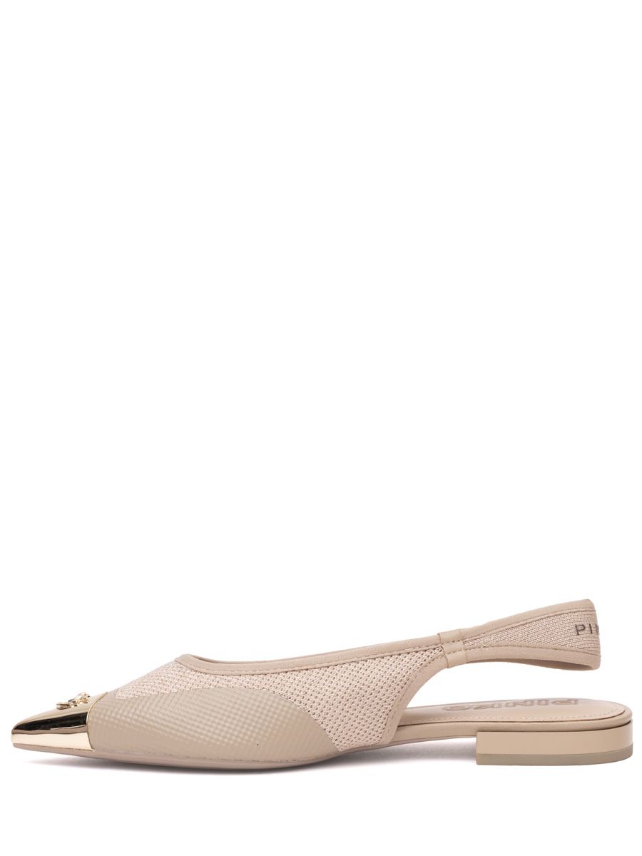 Модель с зауженным мысом, декорированным золотистой металлической накладкой с логотипом, низким каблуком и открытым задником с эластичным ремешком.