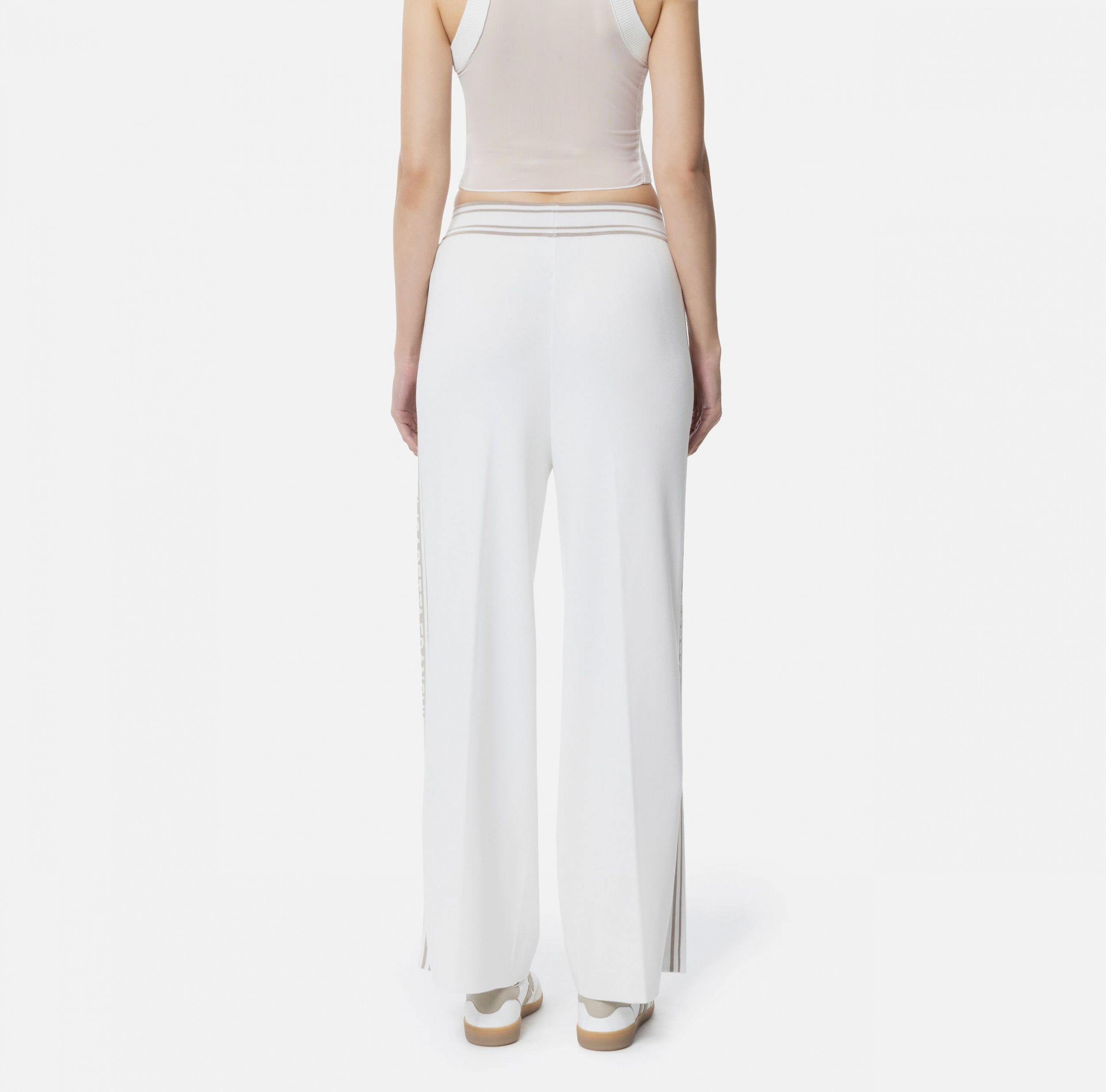 Брюки из вискозы с контрастными лампасами и логотипом на притачном поясе и по бокам, придающими решительность силуэту.