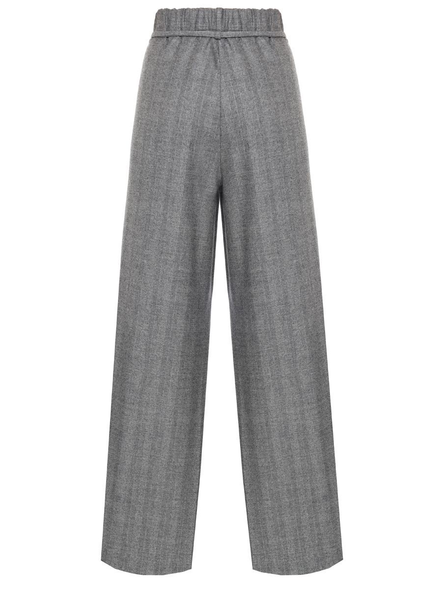 Серые брюки из мягкой шерсти от PANICALE.Модель свободного прямого кроя с высокой посадкой, частично эластичным поясом со шлевками, застежкой на пуговицу.Брюки декорированы поясом-шнурком и полосами из люрекса, создающими деликатный блеск.Изделие идеально впишется в городской стиль и дополнит повседневные образы с рубашкой.