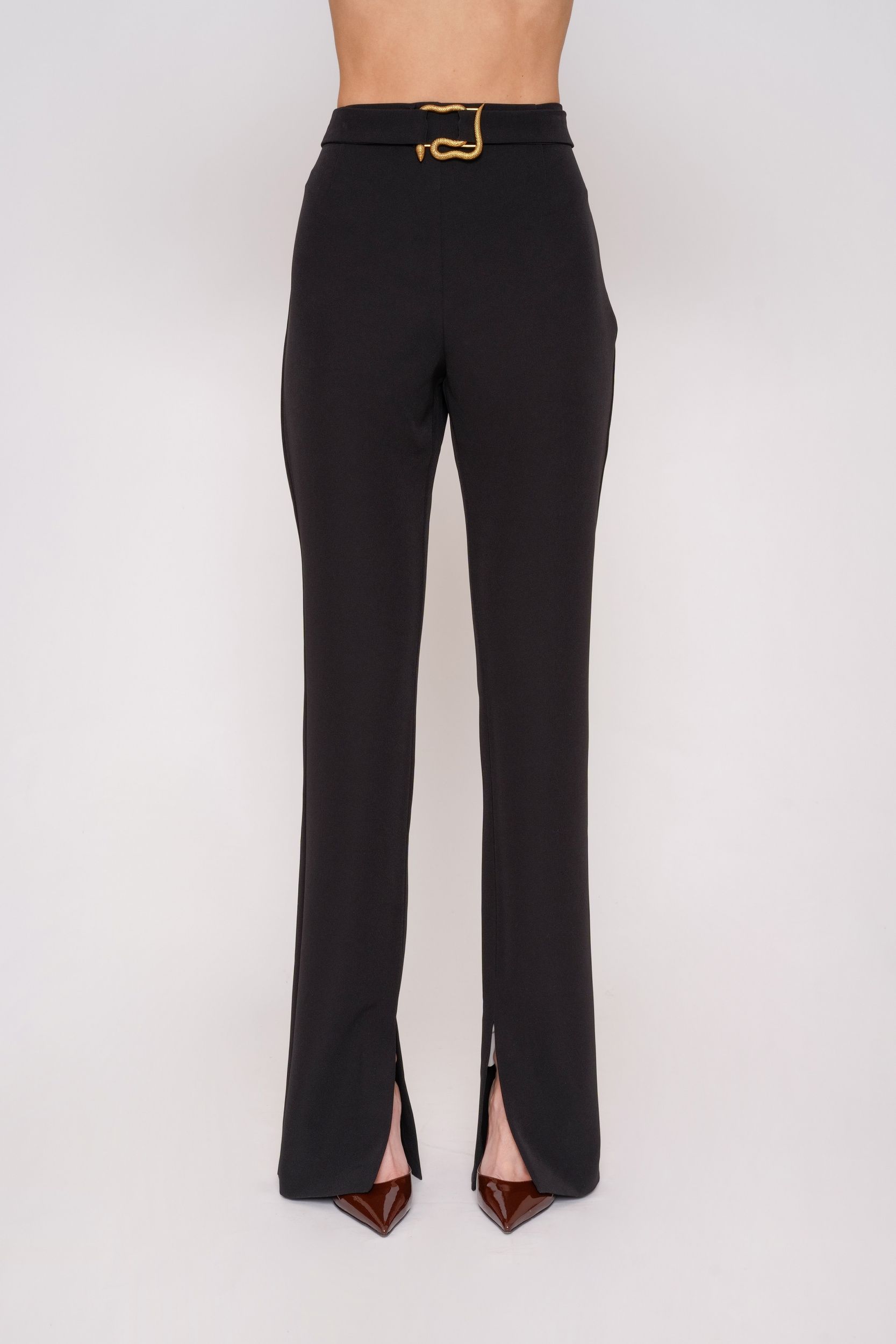 Модель облегающего кроя с клешем от колен с высокой посадкой и ремнем с пряжкой Snake, выполненной в виде змеи оттенка античного золота, высокими боковыми разрезами, которые добавят образу смелости.