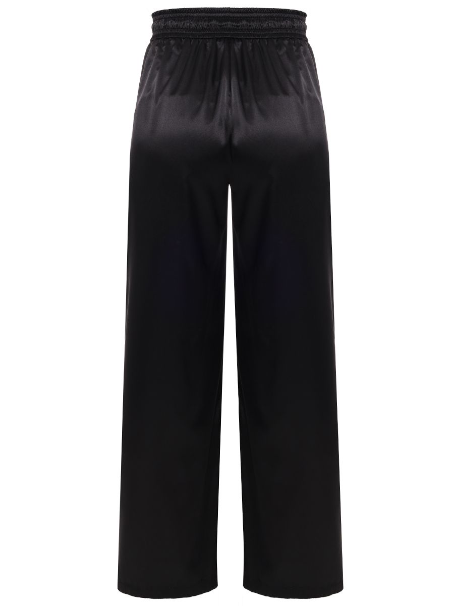 Брюки свободного кроя с широким эластичным поясом на кулиске, гульфиком и прорезными карманами.