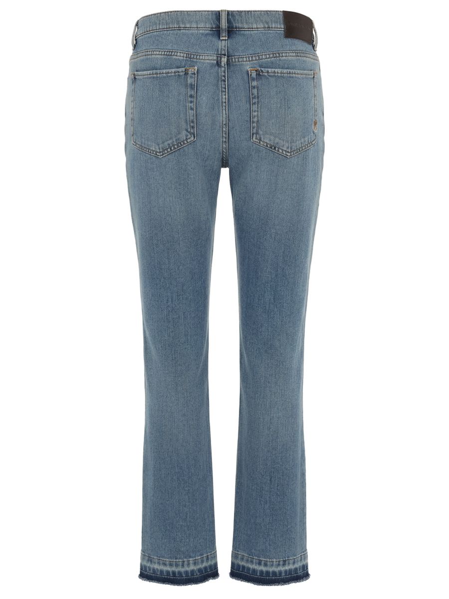 Модель прямого кроя со средней посадкой, поясом со шлевками, прорезными и накладными карманами, застежкой на молнию и пуговицу, фирменной нашивкой с логотипом бренда и необработанным нижнем краем брючин.