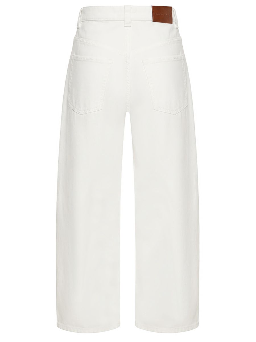 Кремовые джинсы из хлопка от PINKO.-Модель свободного кроя с высокой посадкой, поясом со шлевками, прорезными и накладными карманами, нашивкой с логотипом бренда, застежкой на молнию и пуговицу.-Джинсы комфортно садятся по фигуре и не сковывают движения.