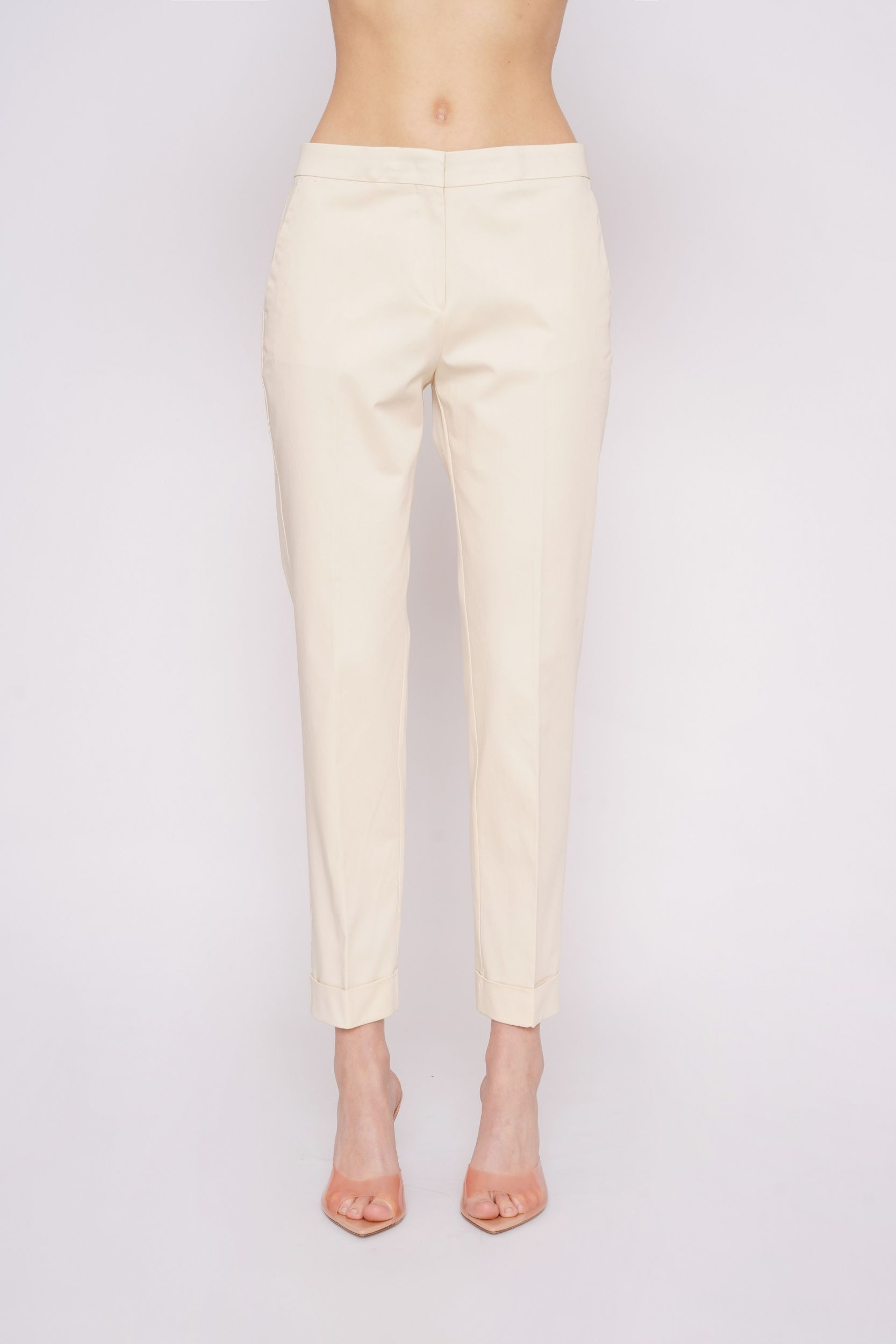 Укороченная модель с кроем по фигуре, стандартной посадкой, прорезными карманами, отворотами в нижней части брючин, застежкой на молнию