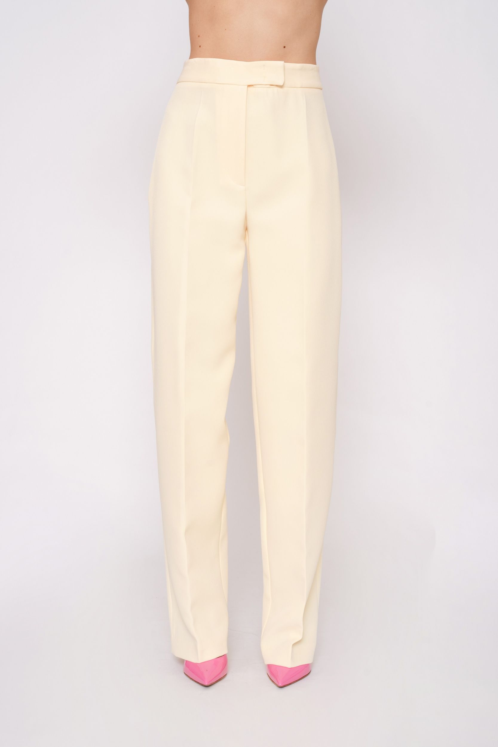 Модель прямого кроя с высокой посадкой, прорезными карманами, застежкой на молнию и графичными стрелками, которые визуально вытягивают силуэт.