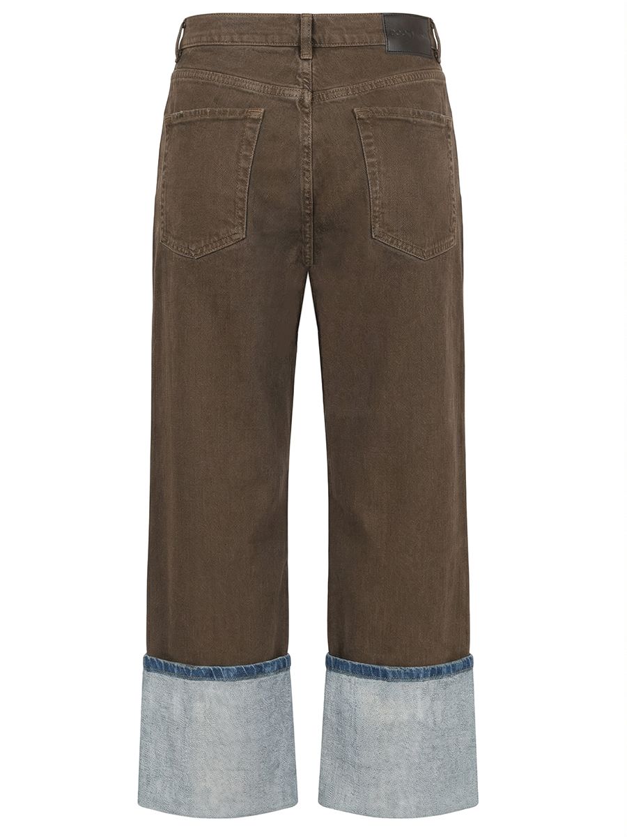 -Модель прямого кроя со средней посадкой, поясом со шлевками, прорезными и накладными карманами, застежкой на молнию и пуговицу, нашивкой с логотипом бренда и контрастными отворотами в нижней части брючин.