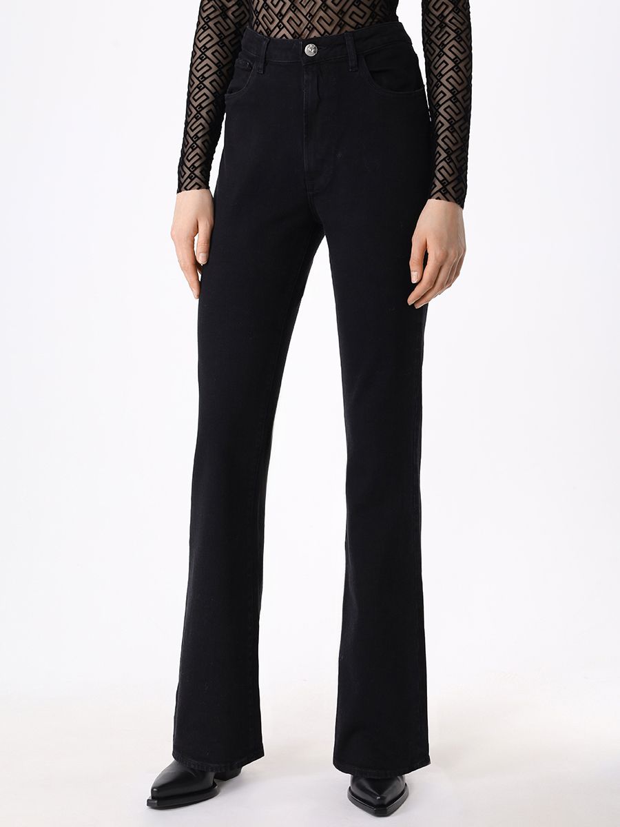 Расклешенная от колена модель с высокой посадкой, поясом со шлевками, прорезными и накладными карманами, застежкой на молнию и пуговицу