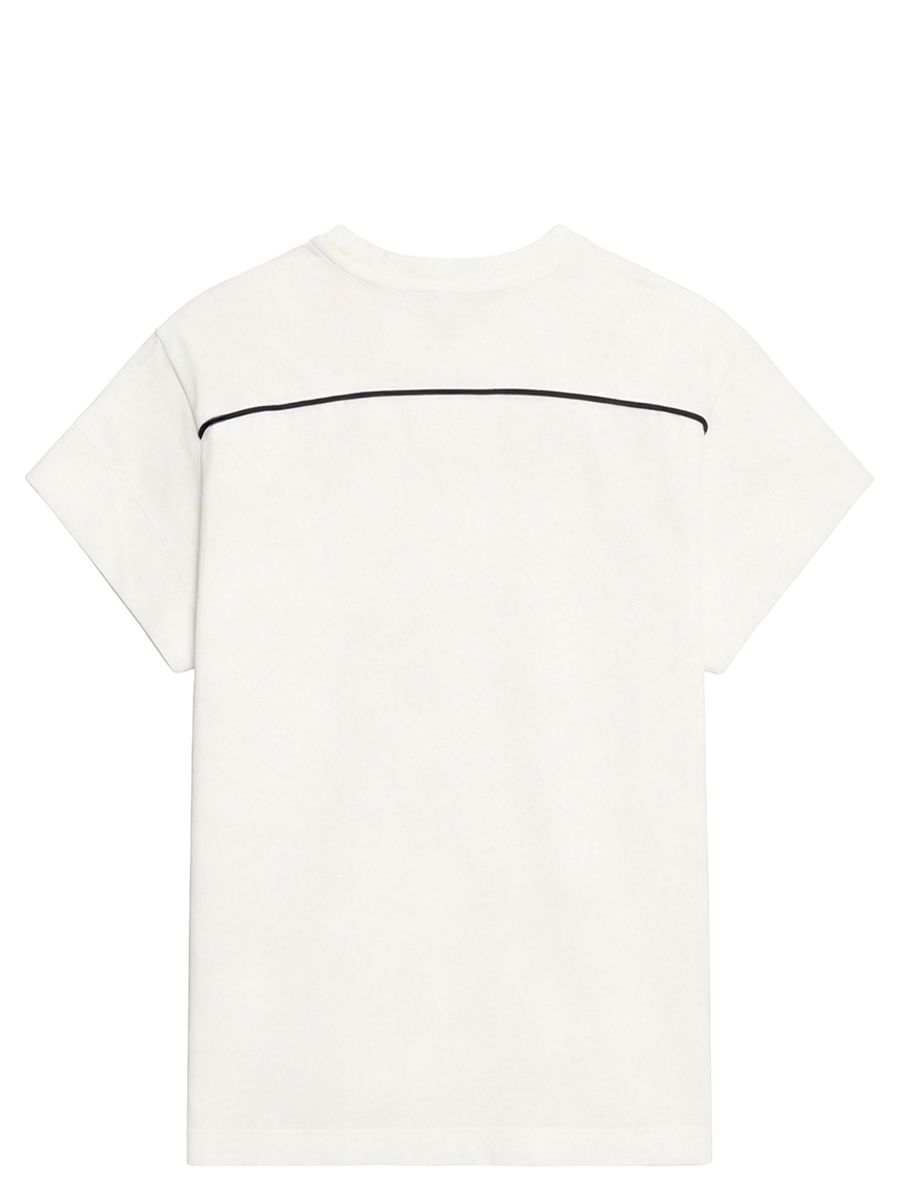 Модель прямого кроя с короткими рукавами, круглым вырезом горловины и фирменными аппликациями Garage, подчеркнутыми вышивкой и стеклярусом.