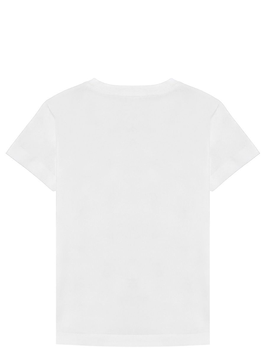 Модель прямого кроя с короткими рукавами, круглым вырезом горловины и контрастным логотипом на груди.