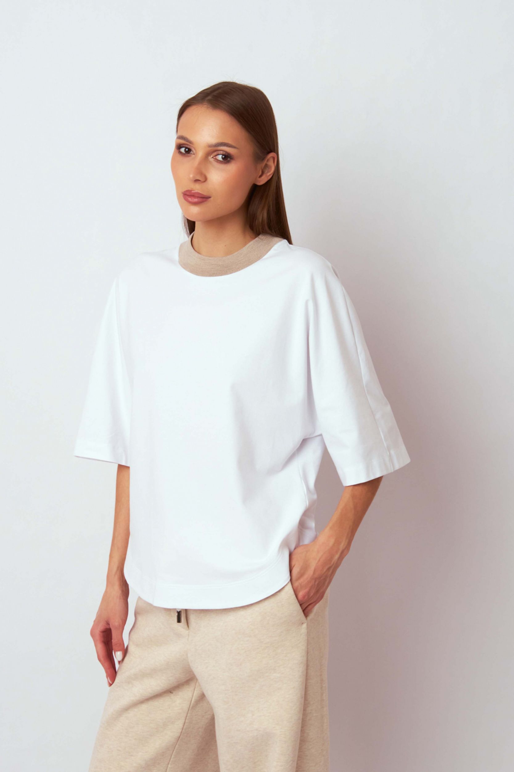 Модель свободного кроя с короткими рукавами и круглым вырезом горловины с контрастной трикотажной отделкой из шерсти.