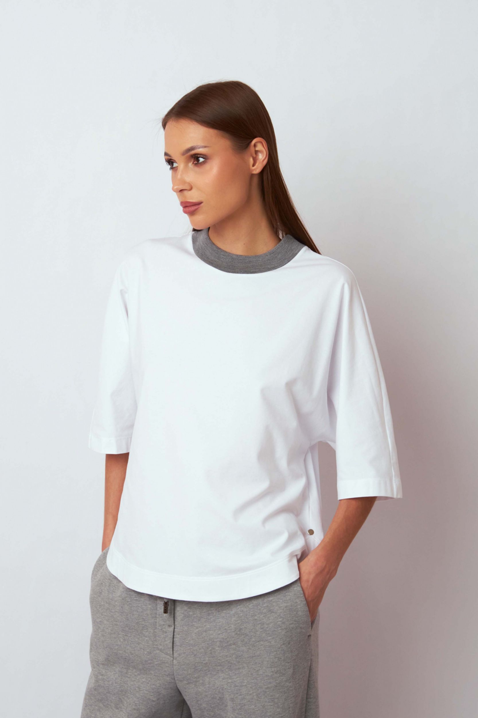 Модель свободного кроя с короткими рукавами и круглым вырезом горловины с контрастной трикотажной отделкой из шерсти.