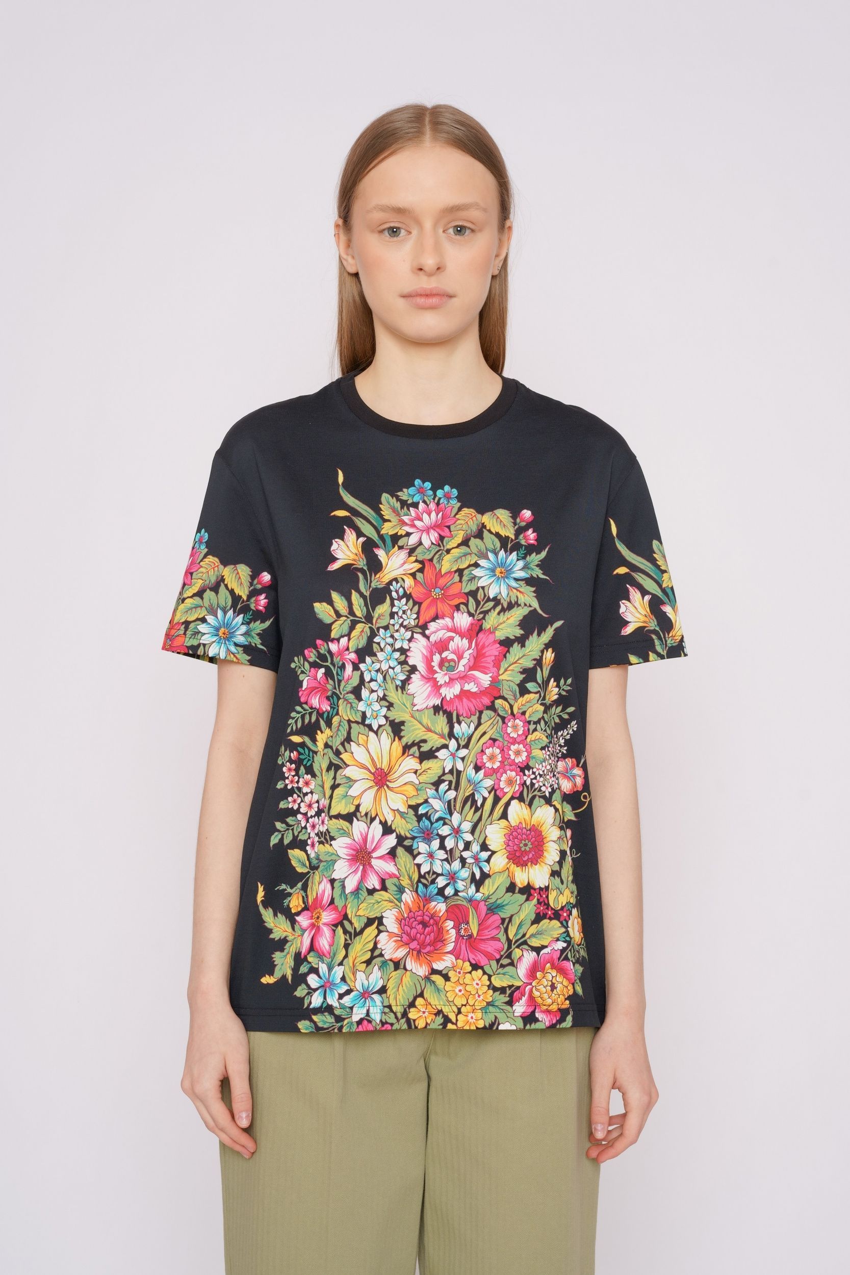 Черная футболка из мягкого хлопка с ярким цветочным принтом от ETRO.