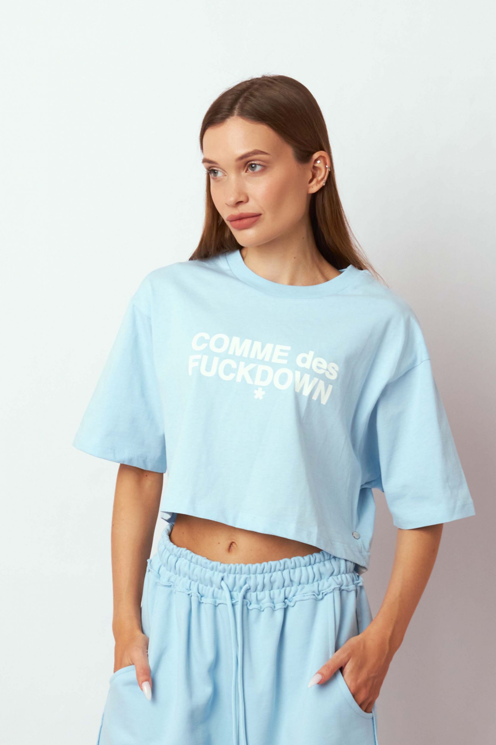 Голубая укороченная футболка из мягкого хлопка от COMME DES FUCKDOWN.