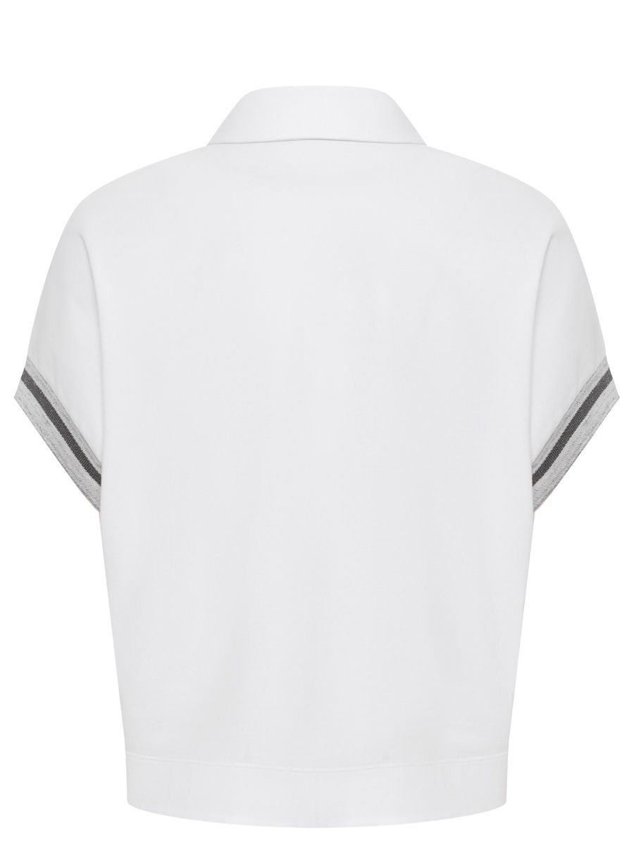 Белое трикотажное поло из мягкого хлопка от PANICALE.Модель свободного силуэта с короткими рукавами, контрастными эластичным манжетами, застежкой на пуговицы на груди, отложным воротником.Поло дополнит повседневные удобные образы с джинсами или брюками в качестве базы под рубашку или сольно.