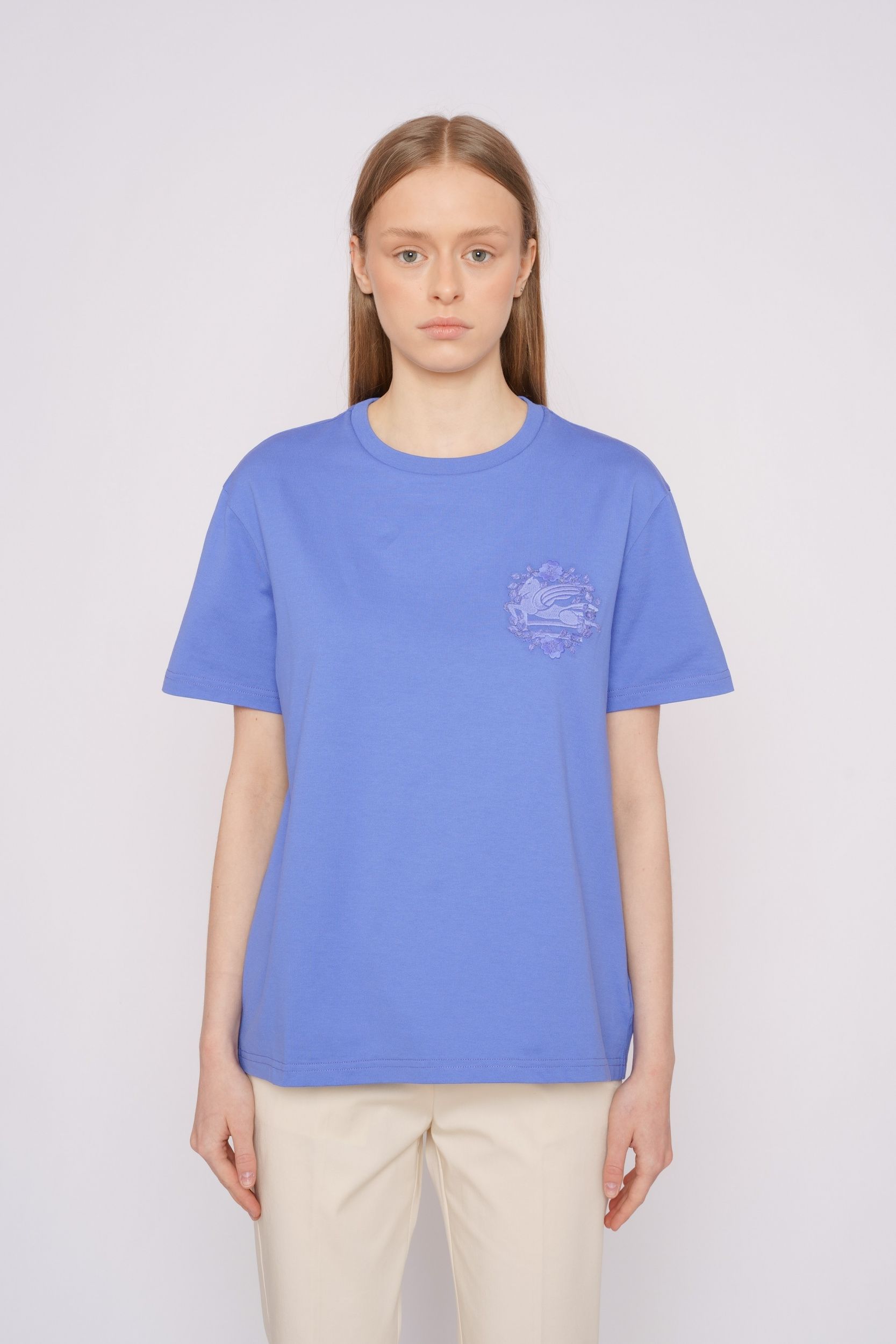 Модель свободного кроя со спущенной линией плеча, короткими рукавами, круглым вырезом горловины и вышитым логотипом на груди.