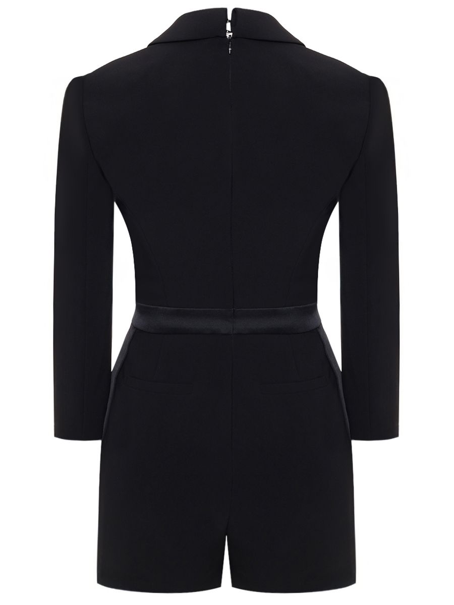 Короткий облегающий комбинезон из лёгкого крепа. Модель обращает на себя внимание традиционными для смокинга элементами, такими как двубортная застёжка с лацканами, притачной пояс на талии и атласные лампасы.