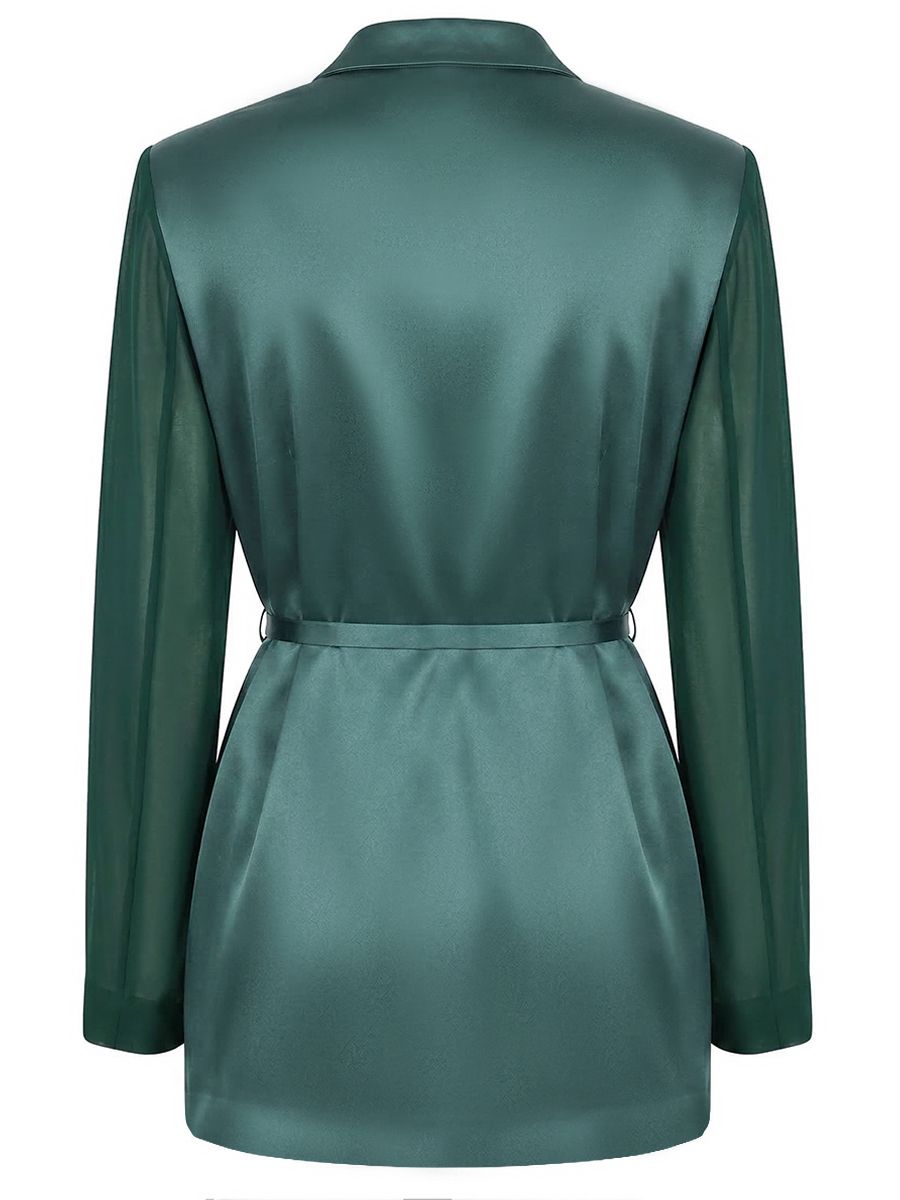 Зеленый жакет из атласа от PINKO.-Модель с длинными полупрозрачными рукавами, отложным воротником с лацканами и прорезными карманами с клапанами.-Узкий пояс в тон с брендированной пряжкой регулирует глубину запаха и структурирует силуэт, подчеркивая талию.