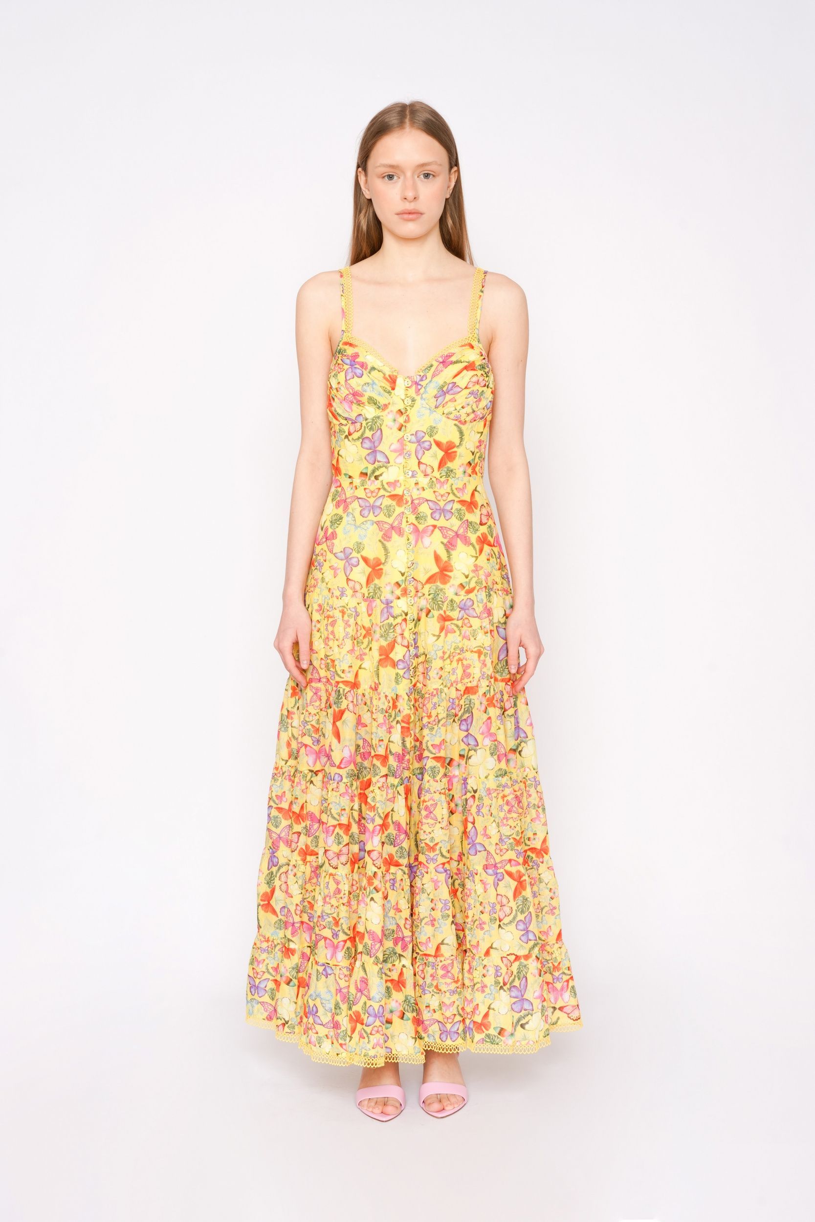 Модель с акцентом кроя на отрезной талии, юбкой А-силуэта с ярусным кроем, широкими бретелями на плечах, V-образным декольте, очерченными чашками лифа.