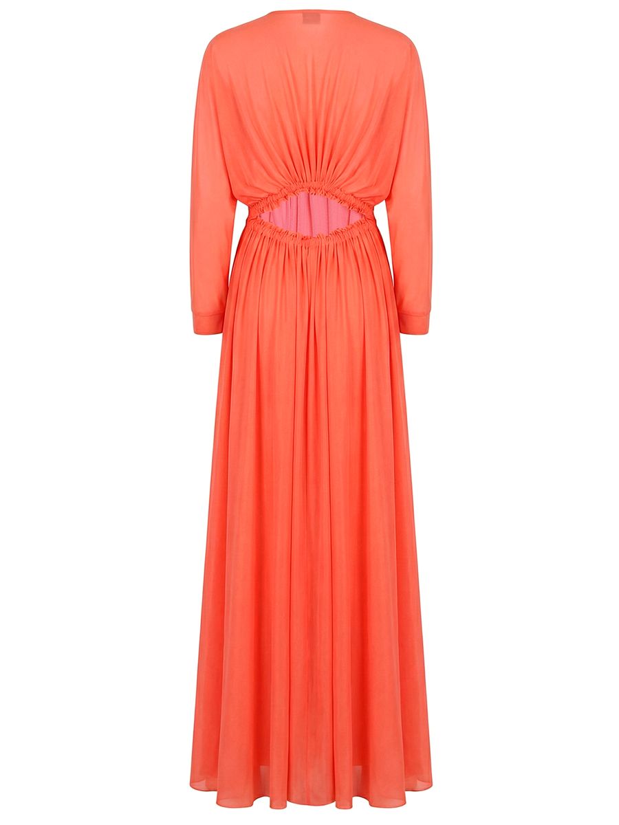 -Модель приталенного кроя с длинными рукавами, глубоким V-образным декольте, эффектным вырезом на спине и расклешенной юбкой, которая свободно ниспадает, образуя мягкие складки, что добавляет образу лёгкости и воздушности.