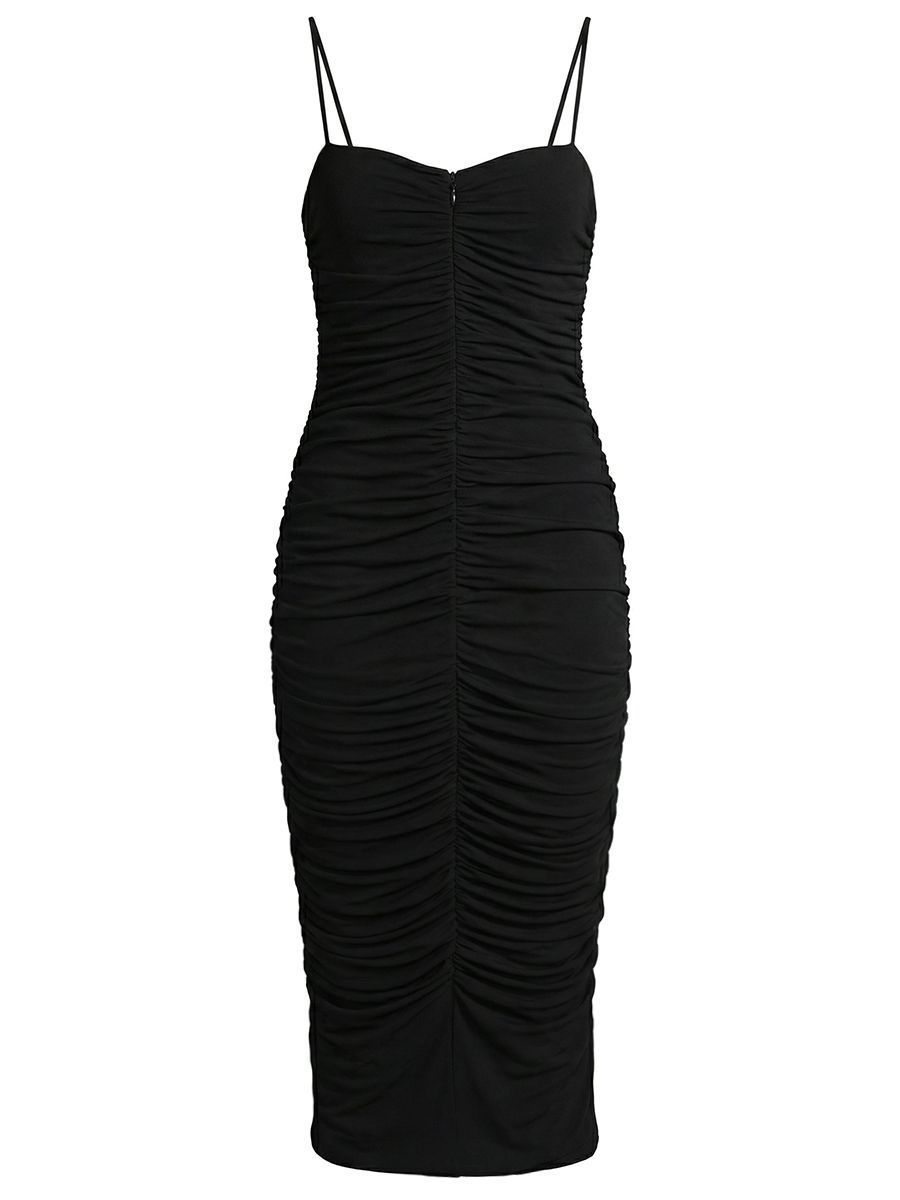 -Модель полуприлегающего кроя с тонкими бретелями, драпировками и застежкой на потайную молнию.