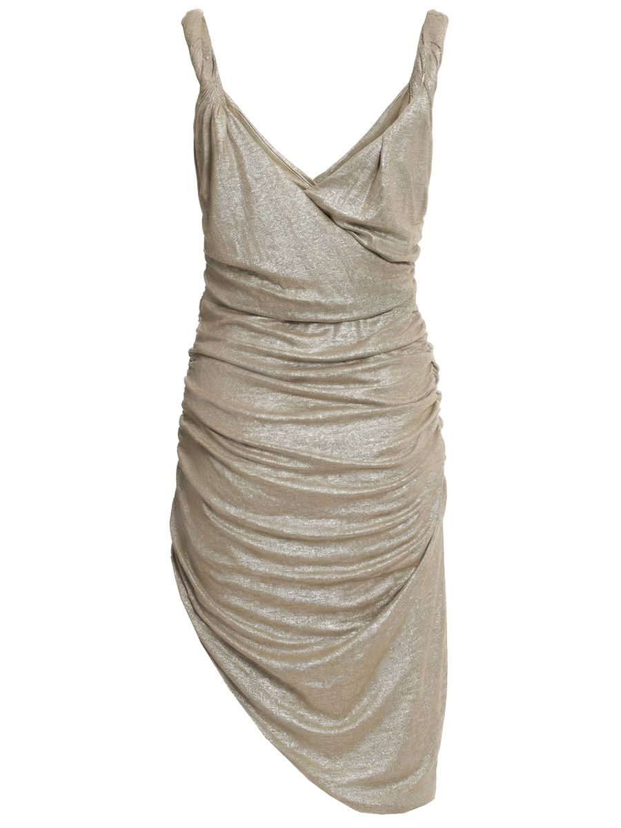 -Модель полуприлегающего кроя с драпировками, асимметричным подолом, глубоким V-образным вырезом на груди и узкими перекрученными бретелями, добавляющими изделию оригинальности.