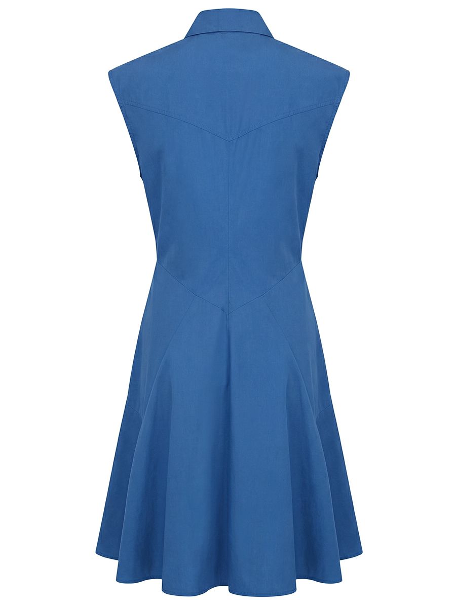 -Модель приталенного кроя без рукавов, с расклешенным подолом, отложным воротником, накладными карманами и застежкой на пуговицы.