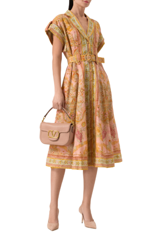 Оранжевое платье-рубашка с принтом из дышащего льна от ZIMMERMANN.