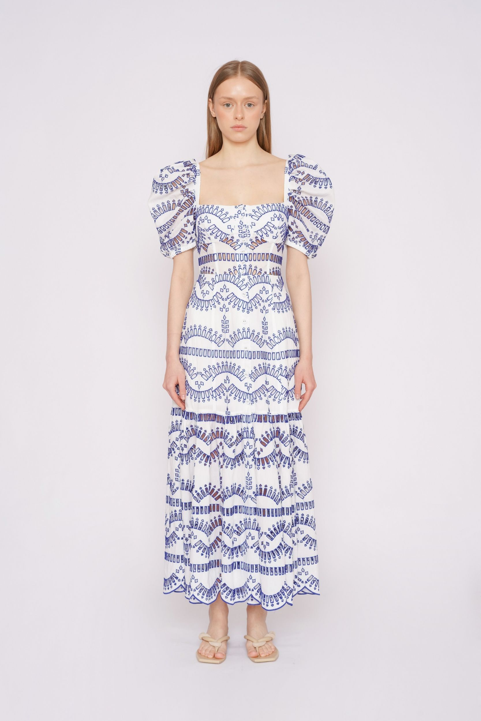 Белое платье-миди из смесового хлопка со сплошным шитьем от CHARO RUIZ.