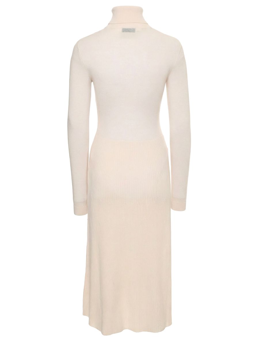 Приталенное платье из смесовой шерсти. Модель слегка расклёшенного книзу силуэта оформлена длинными рукавами и воротником гольф. В области груди и на юбке платье выполнено в резинку для создания изысканного текстурного контраста.