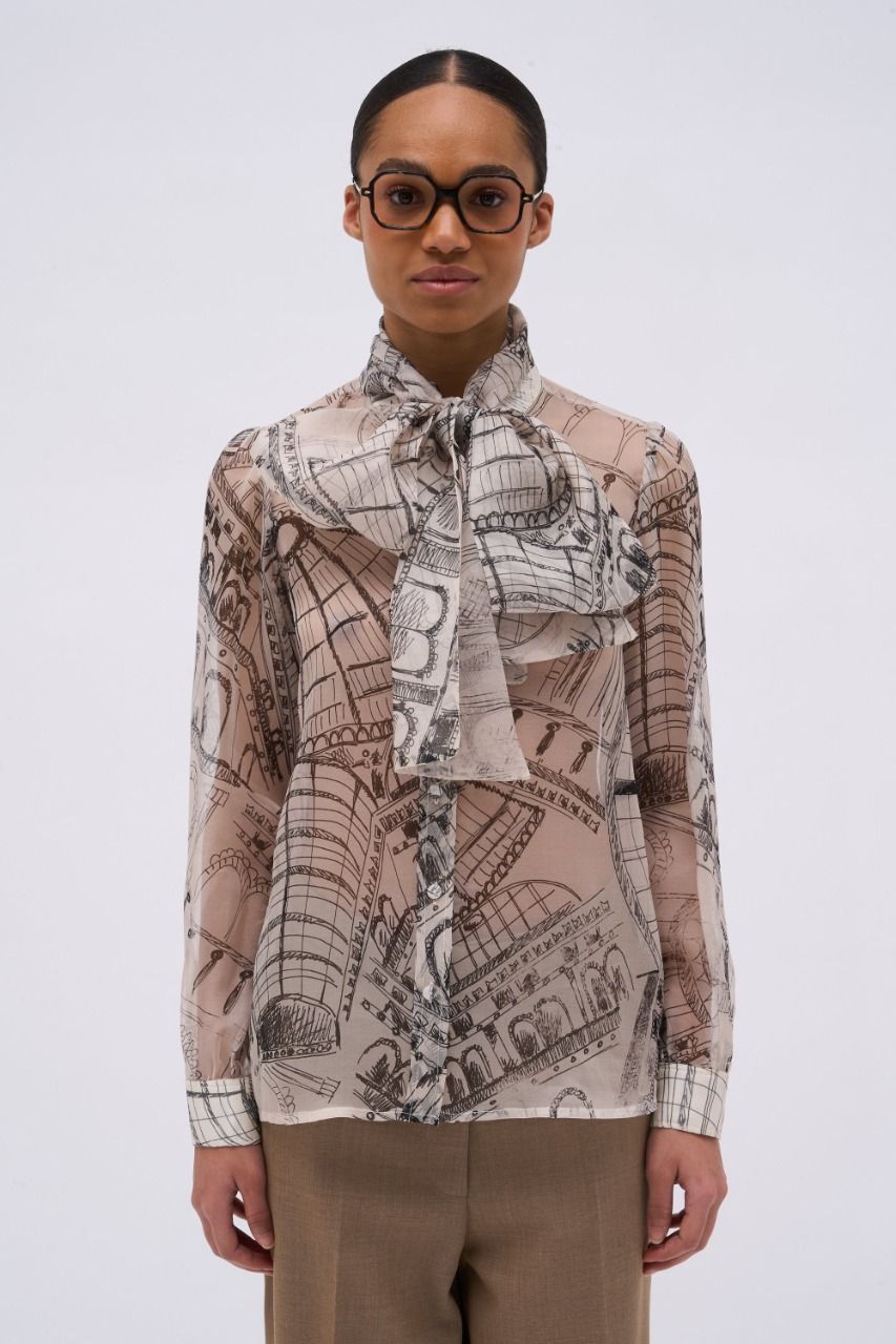Прозрачная рубашка из шелковой органзы с архитектурным принтом SCALA.