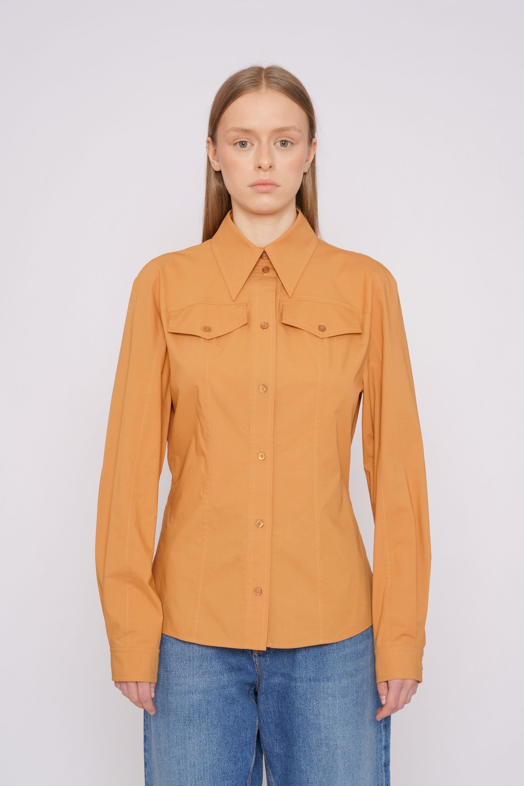 Модель приталенного кроя с длинными рукавами, манжетами, отложным воротником, накладными карманами с клапанами, застежкой на пуговицы.