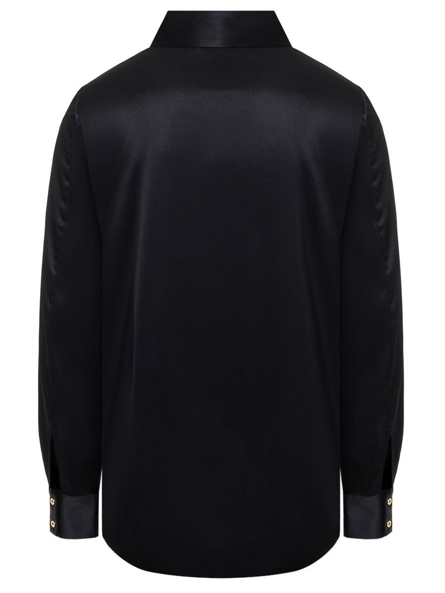 Приталенная рубашка из шёлкового атласа. Модель оформлена воротничком с развязанным галстуком-бабочкой, зигзагообразными отстрочками и роскошным декором с логотипом из стразов.