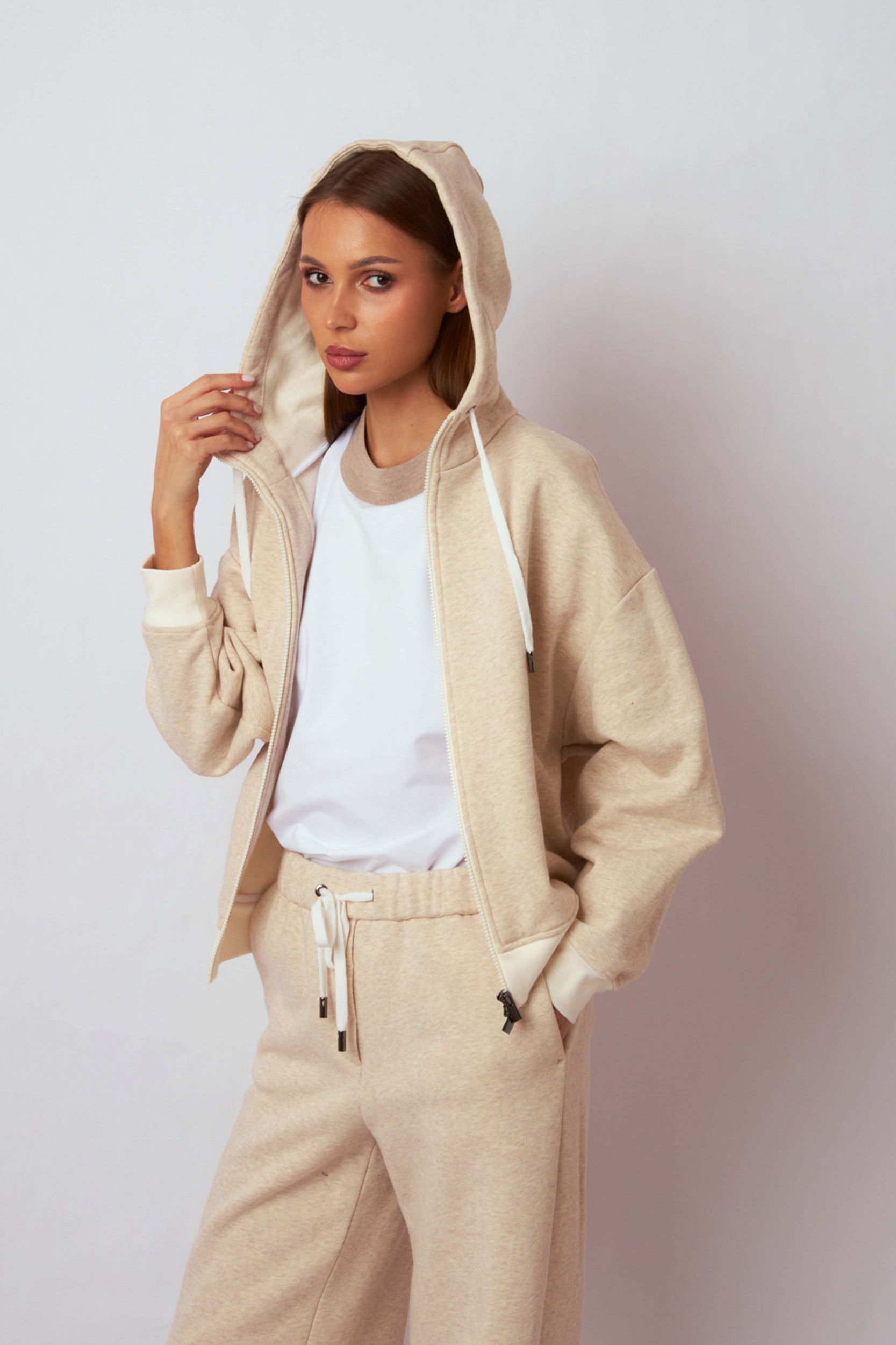 Бежевая толстовка из плотного хлопка от CAPPELLINI. Модель свободного кроя с длинными рукавами, спущенной линией плеча, эластичными манжетами и поясом, капюшоном на кулиске и застежкой на молнию с двумя пуллерами.Толстовка подойдет как для спортивных образов, так и для повседневных аутфитов с джинсами, шортами или брюками.