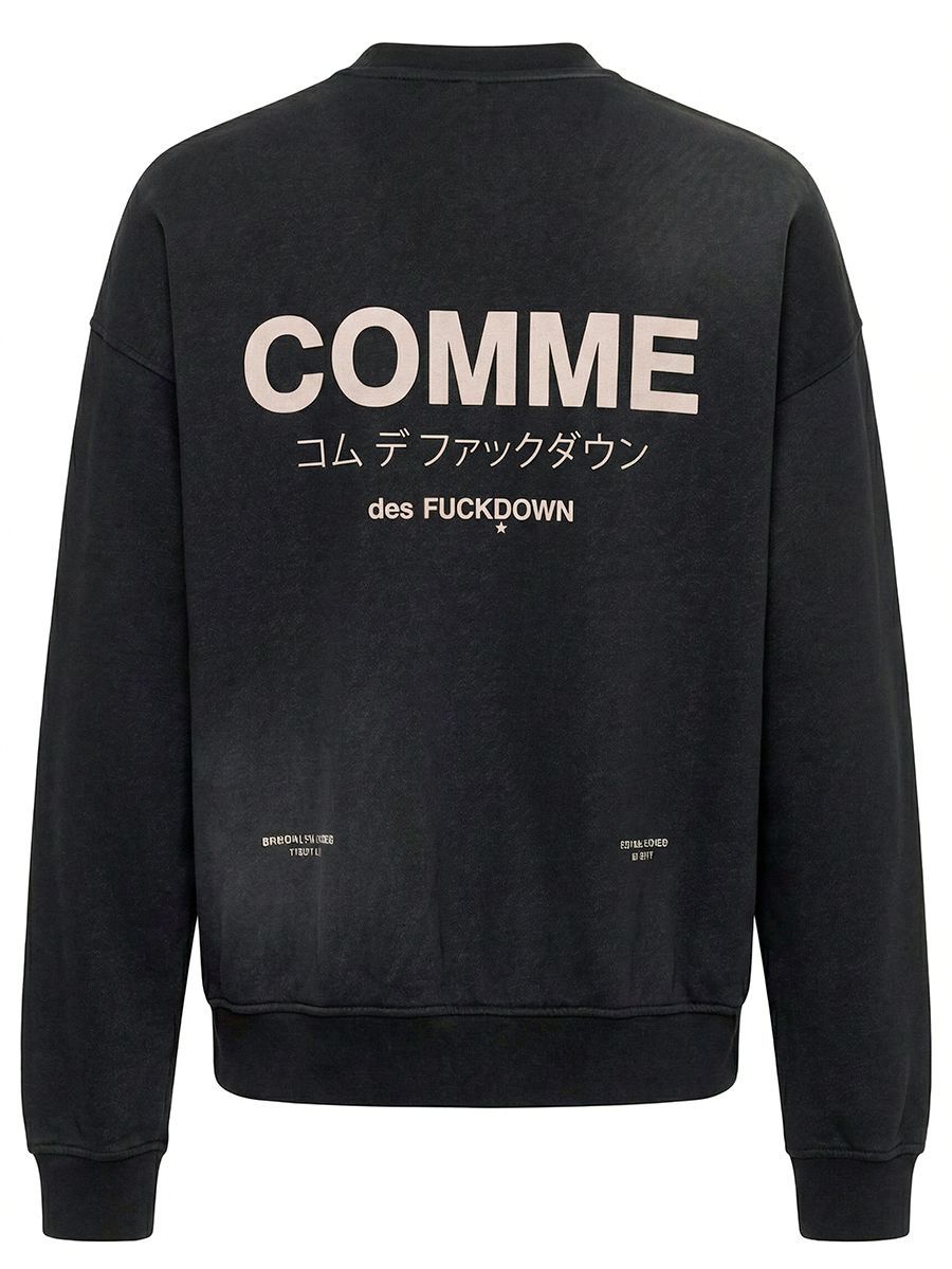Свитшот с отделкой в рубчик выполнили из хлопкового трикотажа, усиленного полиэстером. Выбеленную модель прямого кроя декорировали логотипами спереди и на спинке.