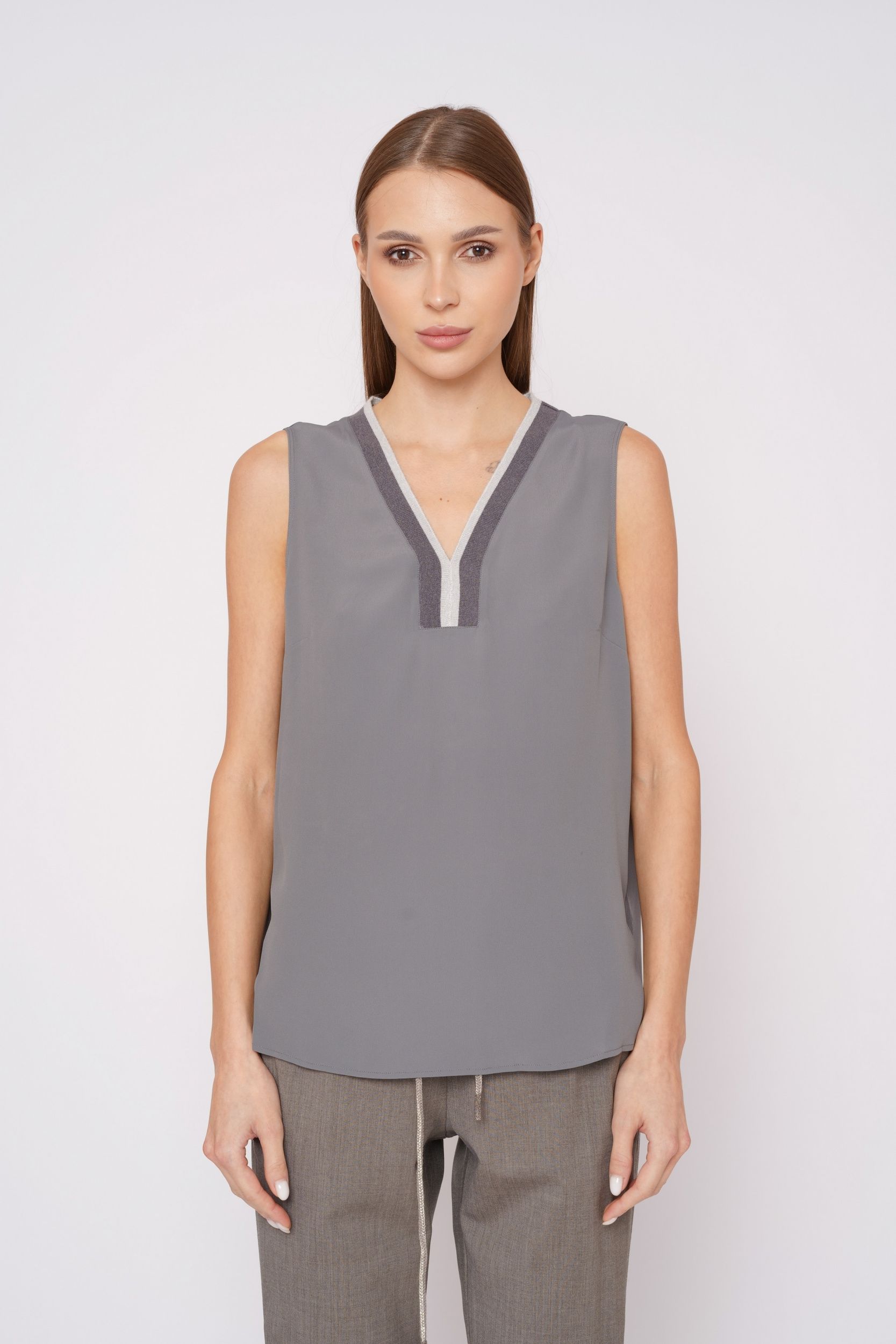 Модель прямого кроя с V-образным вырезом горловины с трикотажной отделкой.