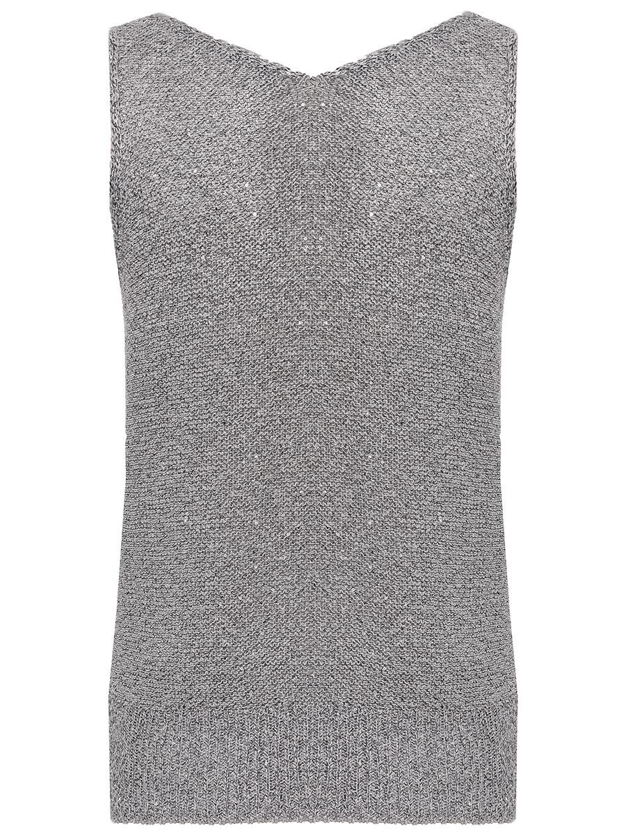 Модель полуприлегающего силуэта с широкими бретелями на плечах, глубоким вырезом на груди и декором пайетками и люрексом, которые добавляют изделию легкие блики.