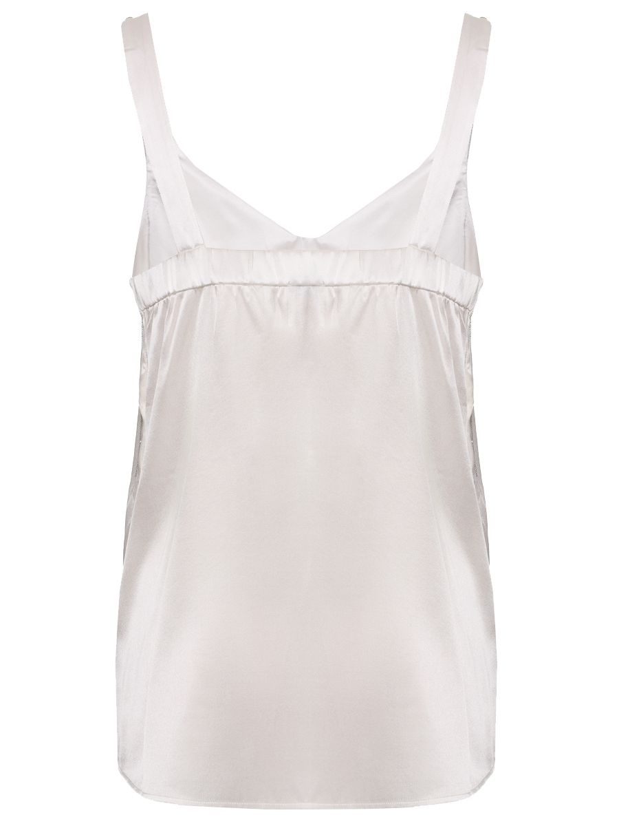 Бежевый топ из стрейчевого шелкового атласа от PANICALE.Модель с V-образным вырезом и эластичной вставкой на спинке, широкими бретелями и декором по бокам длинными цепочками жемчужного плетения.Топ отлично подойдет как для повседневного расслабленного, так и для более элегантного образа.
