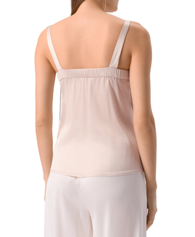 Топ из стрейчевого шелкового атласа в золотом цвете от PANICALE.Модель с V-образным вырезом и эластичной вставкой на спинке, широкими бретелями и декором по бокам длинными цепочками жемчужного плетения.Топ отлично подойдет как для повседневного расслабленного, так и для более элегантного образа.