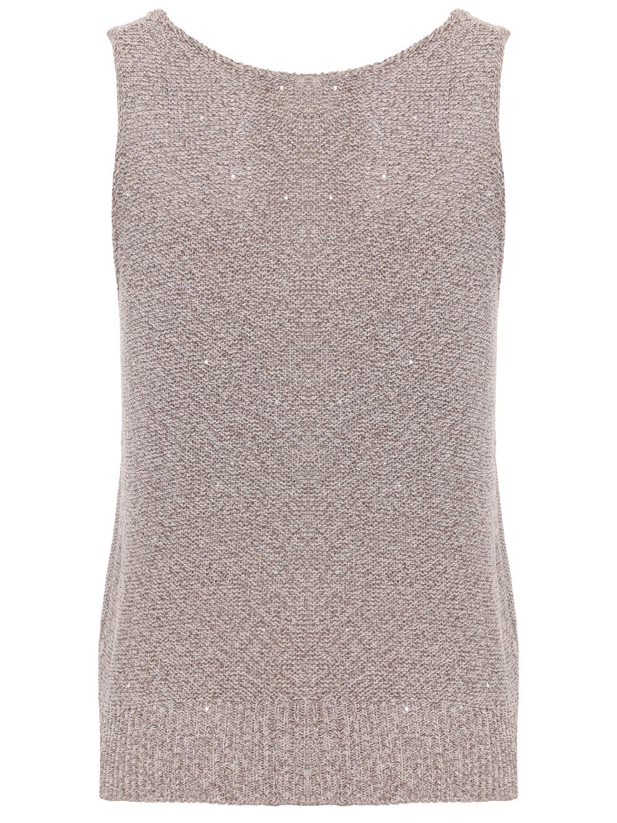 Коричневый вязаный топ купажированного состава от PANICALE. Модель полуприлегающего силуэта с широкими бретелями на плечах, глубоким вырезом на груди и декором пайетками и люрексом, которые добавляют изделию легкие блики.     Топ отлично подойдет как для повседневного расслабленного, так и для более элегантного образа.