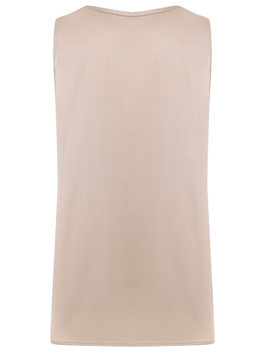 Топ из нежного шелка от PANICALE. Модель свободного кроя без рукавов, с круглым вырезом горловины, украшенным узкой серебристой цепочкой Мониль. Нежная ткань с добавлением эластана немного тянется, поэтому топ дает полную свободу движениям