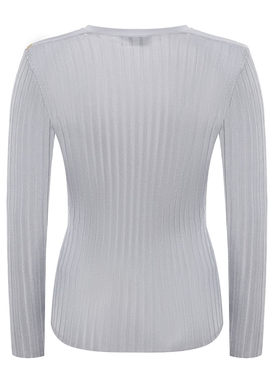 Облегающий джемпер из вискозной пряжи. Модель с длинными рукавами и V-образным вырезом горловины украшена бейкой в тон на плечах и декором в виде логотипа из золотистого металла, привносящим в изделие блестящий штрих.