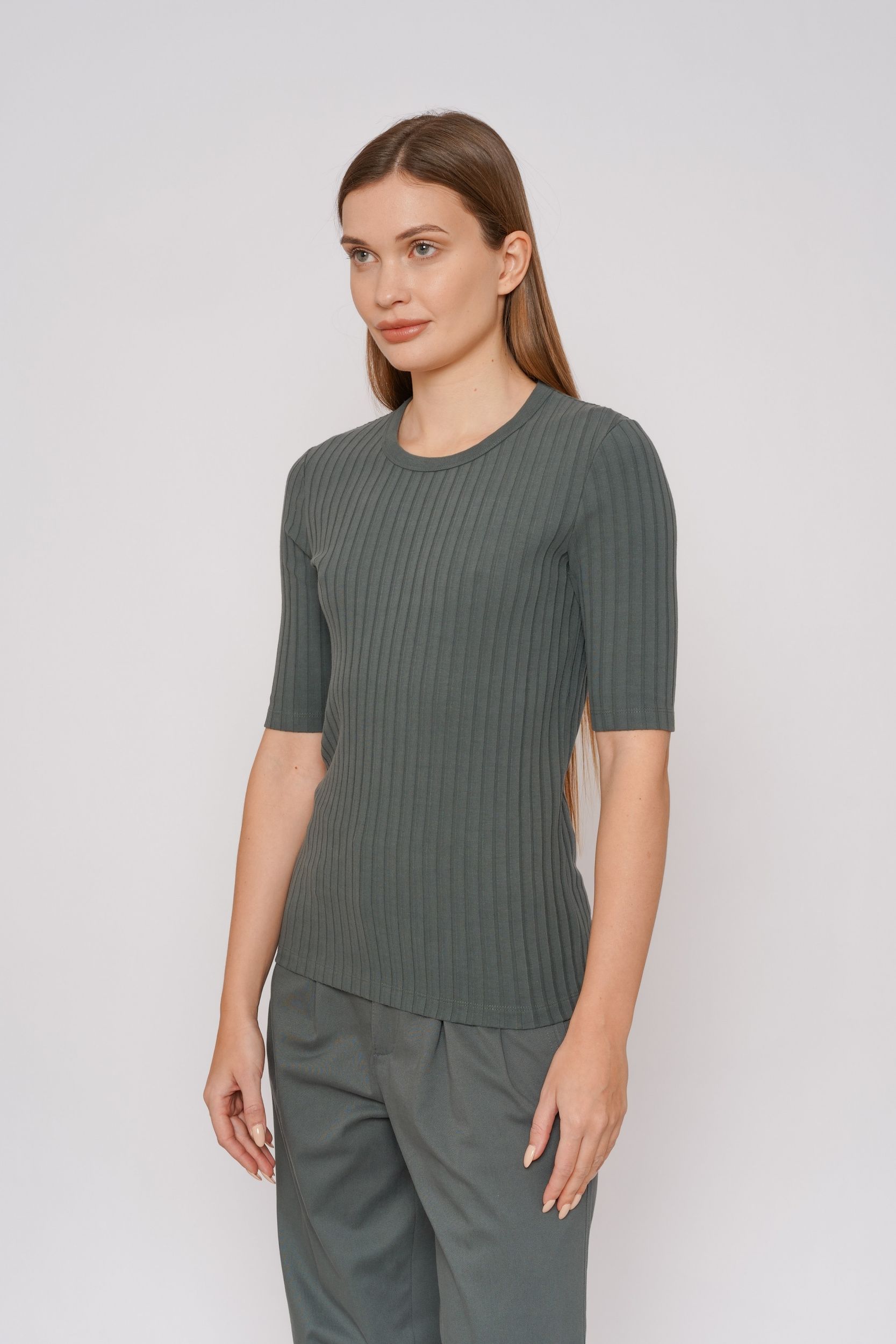 Модель полуприлегающего кроя с короткими рукавами и круглым вырезом горловины.