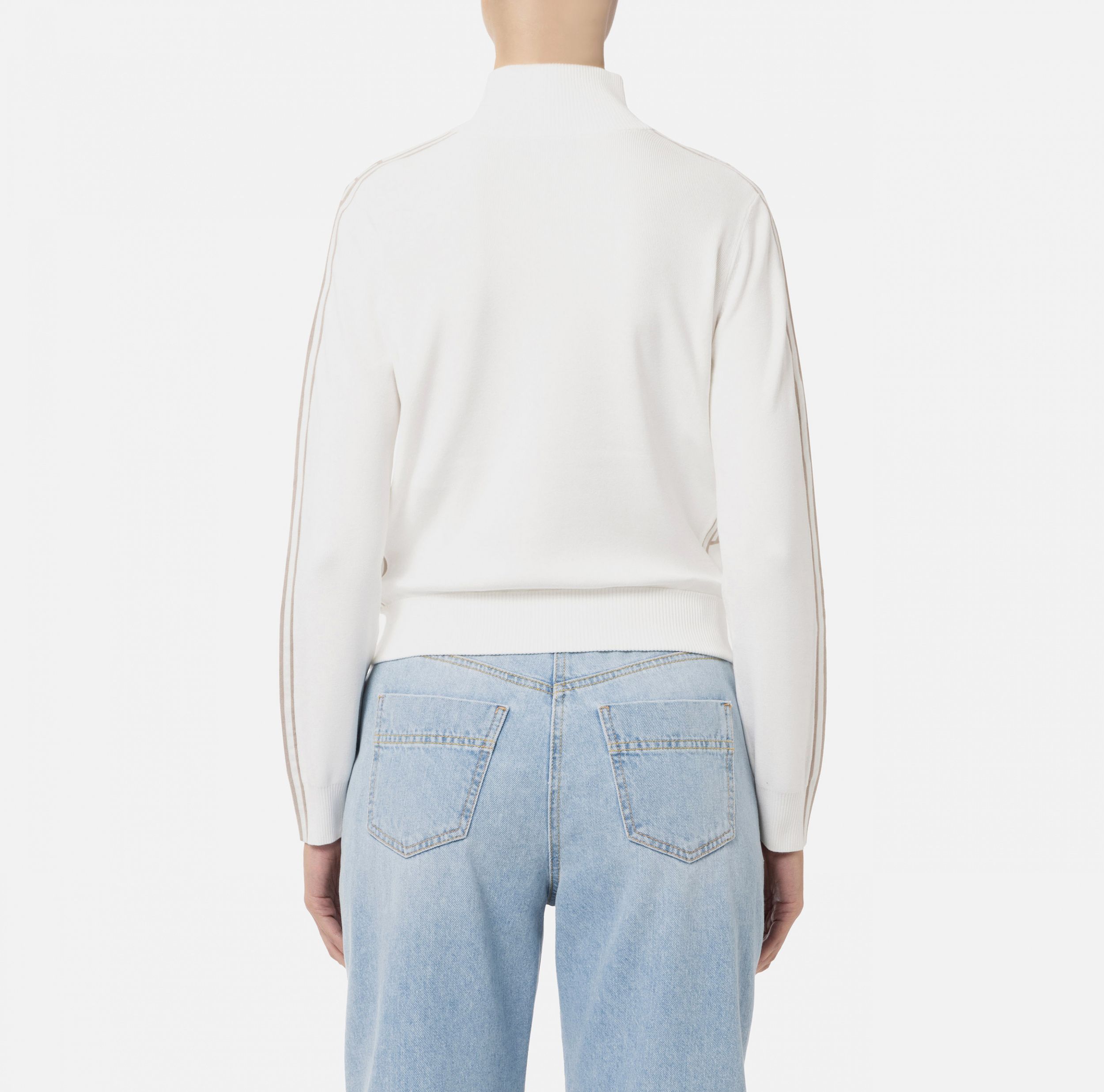 Модель оформлена длинными рукавами, карманами спереди и застёжкой-молнией из золотистого металла с логотипом на пулере.