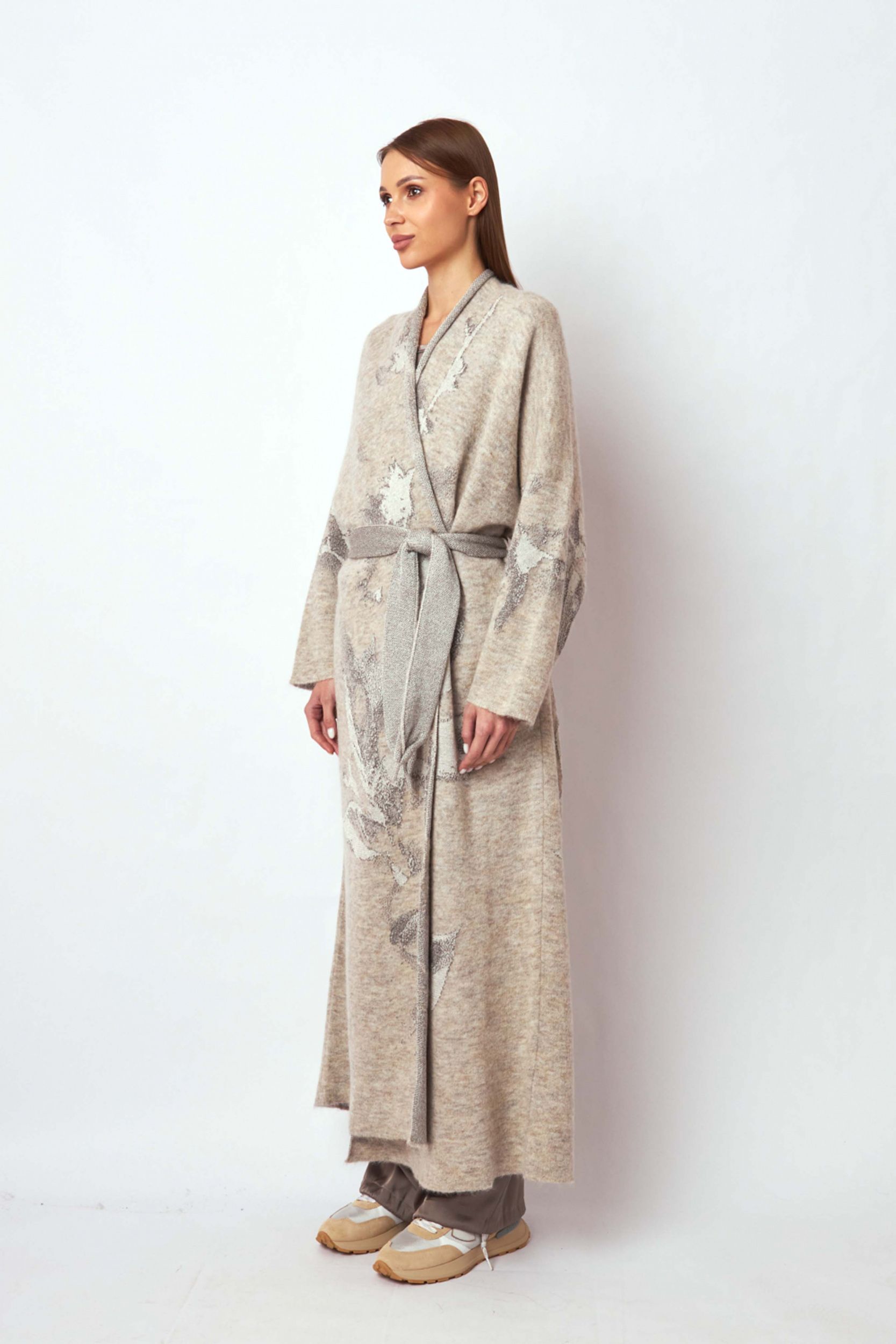 Серо-бежевый удлиненный кардиган с принтом из смесовой шерсти от PANICALE.